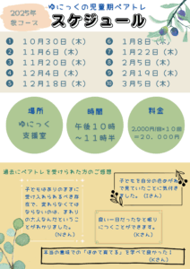 児童期版(年長~小3)は、10月30日(木)よりスタートし、約2週間に1度、木曜日の10時~11時半に行います。