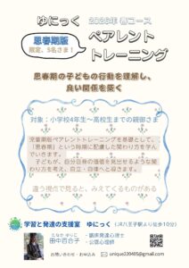 こちらは、小学校4年生~高校生までのお子様がいらっしゃる親御様向けのコースになります。八王子市にある「ゆにっく支援室」での対面開催。